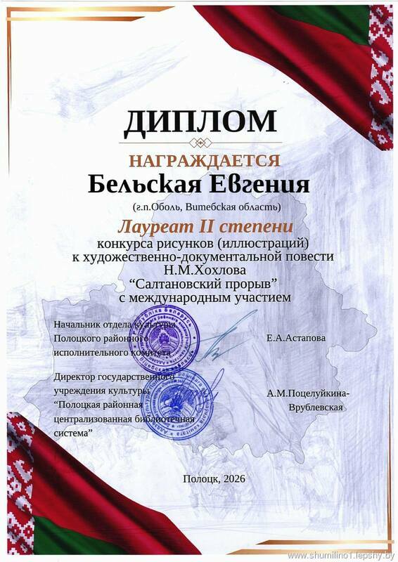 Диплом II степени получен Бельской Евгенией за яркое участие в конкурсе рисунков (иллюстраций) к художественно-документальной повести Н. М. Хохлова "Салтановский прорыв" с международным участием